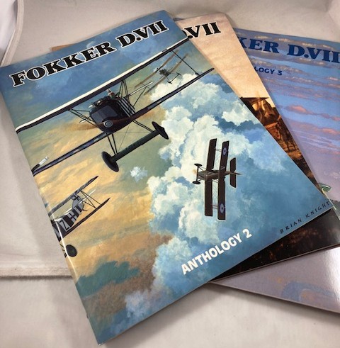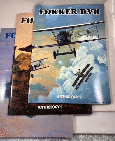 Large format paperbacks, staple bound in pictorial covers. The three volume Windsock Datafile Special Anthology published by Albatros Productions in 1997, 2000 and 2002 Vol.1 68 pages, Vol. 2 68 pages, Vol.3 64 pages. inclusive of covers. All first editions, all printed. N.B. Anthology 3 contains an advert for another issue to follow in this series but we can find no record of it ever have being published. Profusely illustrated with rare archive black and white photographs, numerous color drawings and profiles and 1:48 and 1:72 scale drawings and other diagrams. An excellent resource for the scale-modeler and airplane enthusiast. As Ray Rimell the editor wrote in the introduction. “it is at the modelmaker that this anthology is squarely aimed.. By providing completely new and revised scale drawings, computer-generated cockpit schematics, a graphic resume of the types oft-misinterpreted features and the first serious attempt to begin recording all known D.VII unit markings, this book(s) breaks new ground in WWI aviation publishing.” No previous ownership marks. A clean, fresh and unmarked set in like new condition. Difficult to source in the complete set, this collection is a worthy addition to any aviation library. As new.