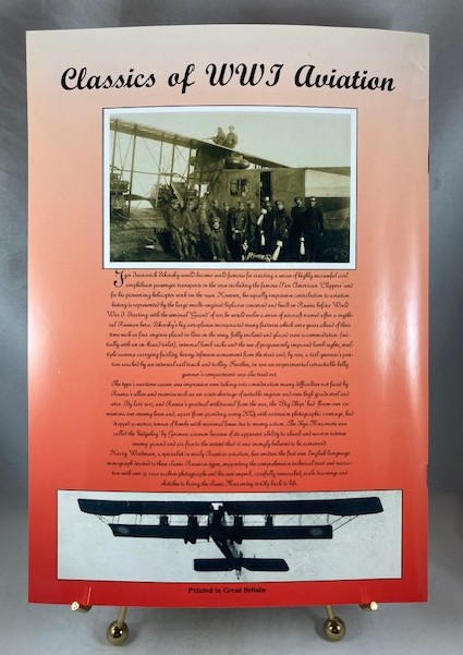 Large format paperback, staple bound in pictorial covers, the number 3 issue of “Classics of WWI Aviation”, published by Albatros Productions. 44 pages plus covers. Illustrated with 54 rare archive black and white photographs,8 pages of detailed 1:48 and 1:72 scale drawings by Harry Woodman together with detailed airframe and engine drawings; and two color profiles by Ray Rimell on inside covers. First edition. The product of 25 years of research this monograph is, outside of Russia, the best source of documentation for these four-engined behemoths ever published. An excellent resource for the scale-modeler and airplane enthusiast. No previous ownership marks. A clean, fresh and unmarked copy, like new.