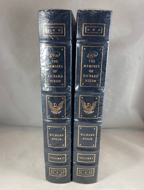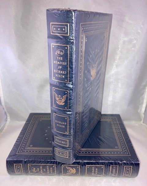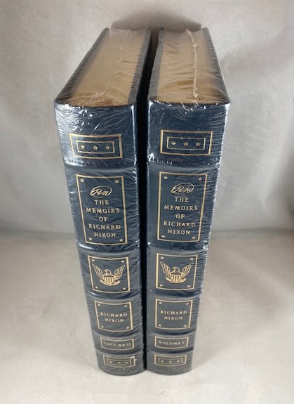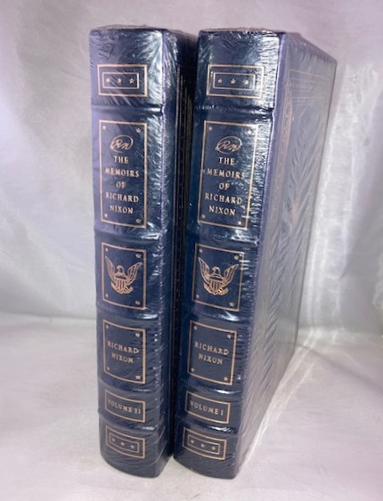 Hardcovers, complete in two volumes, uniformly bound in genuine gilt stamped dark blue leather. Brand new copies still in factory shrink-wrap.. With 24 unnumbered pages of illustrations. A quality Easton Press production with all the refinements that go to make these truly fine bindings: bound in satin ribbon marker, all edges gilt, raised spine, 22kt gold stamping, smyth-sewn binding, silk moire end-papers, acid free archival paper and full genuine leather binding. Easton Press book-plate and Collectors Notes laid-in loose. This two volume Easton press edition of Nixon’s autobiography describes the early years of his life till the presidential election of 1972 (vol.I) and relates the events from the election of 1972 until his resignation in 1974 (vol. II). First published by Easton Press in 1988, this title appears in both signed and unsigned states. N.B. Pleae note binding style, particulary the lower rectangular box at bottom of spine which contains three stars. The Easton Press published two different printings of this binding style, differentiated by the present style with three stars and another similar binding, exact in all respects, but with two stars, with the center star replaced by a small Easton Press logo (E/P). We could not determine if this incongruity corresponds in any way in determining if the respective edition is signed or unsigned. Having said that, we are selling the present set as unsigned. A new and pristine gift quality set. A heavy set, Priority and International orders will be charged postage at actual cost.