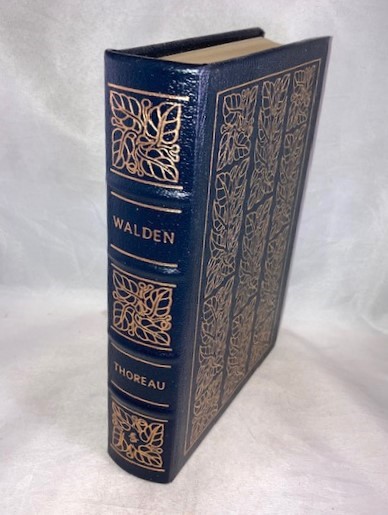 Hardcover, octavo volume bound in full deep navy blue gilt stamped decorative leather. 335 pages. Illustrated with a portrait and wood-engravings, both full page and vignette, by Thomas W. Nason. This special edition of “Walden” designed by Carl Purington Rollins. A quality Easton Press production with all the refinements that go to make this a truly fine binding: silk moire end-papers and bound in ribbon marker, all edges gilt, raised spine, 22kt gold stamping, smyth-sewn binding and full genuine leather. A title in the Collector’s Edition, the 100 Greatest Books Ever Written. Small round previous corporate owner’s blind-stamp on title-page at lower fore-edge corner. Else a clean, tight, fresh and unmarked copy, like new. Near fine.