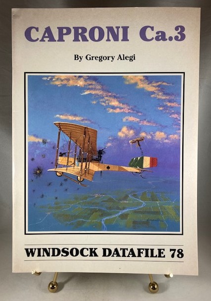 Large format paperback, staple bound in white pictorial covers. 40 pages plus covers. Illustrated with 102 rare archive black and white photographs; 10 pages of detailed 1:48 and 1:72 scale drawings by Ian R. Stair and three color profiles by Ray Rimell on rear cover. “Fabric: Camouflage and Markings” and Appendices round out this issue. First edition. Developed from earlier types from the beginning of the war, the Caproni Ca.3 (aka Caproni 450 hp) first flew in late 1916. Between 250 and 300 of these aircraft were built. A very scarce Datafile. [N.B. there appears to be a duplication of ISBN’s for this title and Datafile.no. 76, Martinsyde Buzzard. If searching exclusively with ISBN check if the book is the title you want before ordering.] An excellent resource for the scale-modeler and airplane enthusiast. No previous ownership marks. A clean, fresh and unmarked copy. Fine.